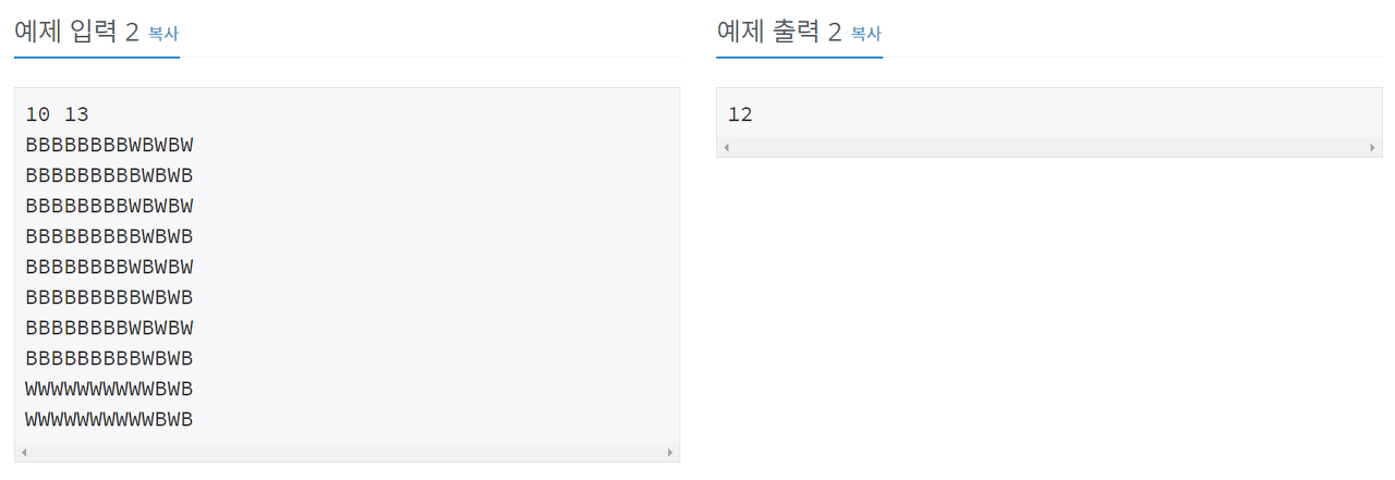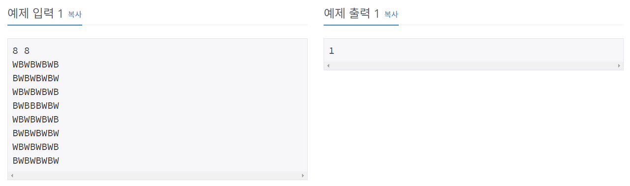 - 'W'로 시작할 때 맞는 경우는 'B'로 시작했을 때 틀린 경우와 같기 때문에 굳이 두 값을 구해주지 않아도 한 값을 구한 후 64(체스판의 크기)에서 빼주면 됨